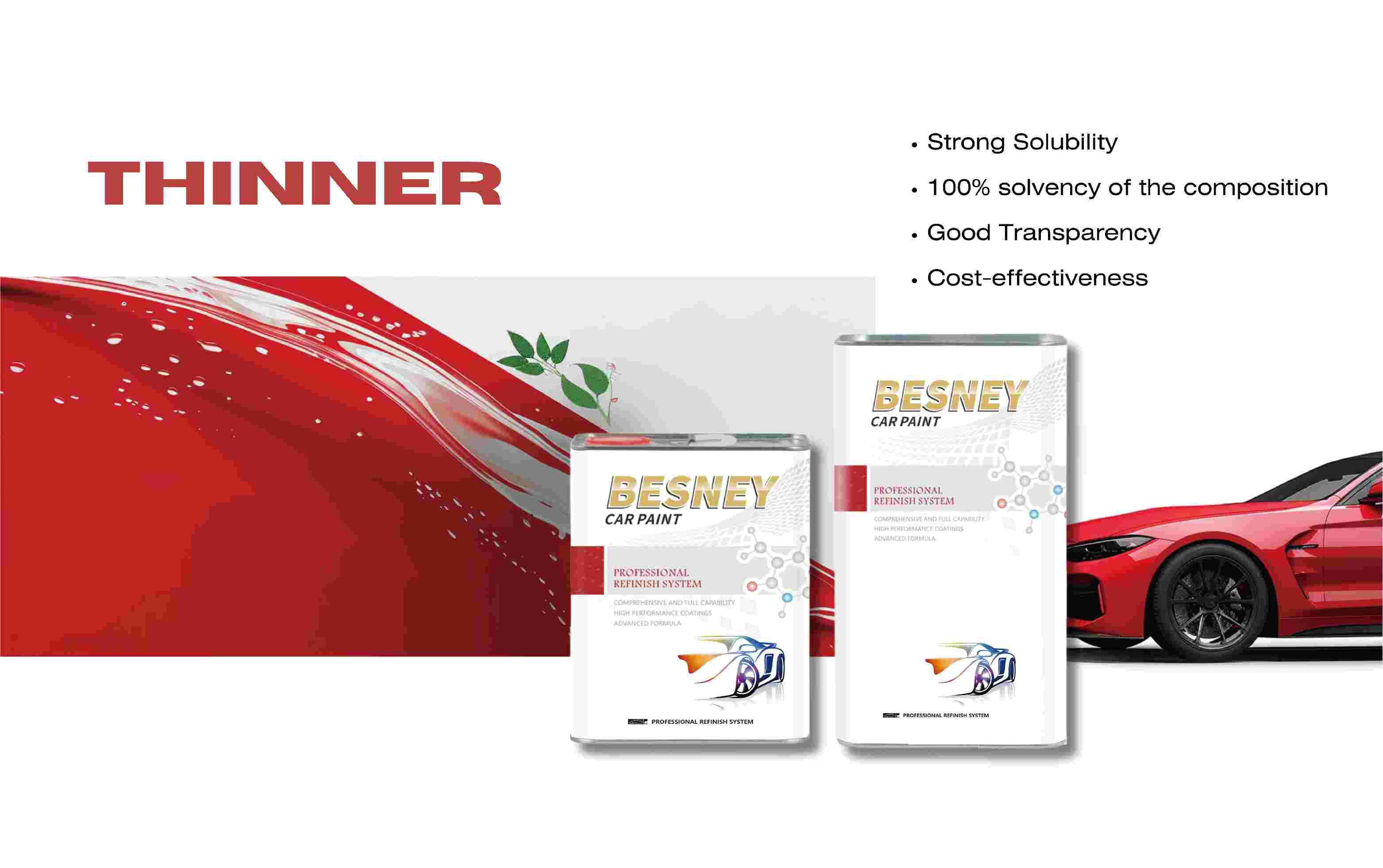 BESNEY Automotive Thinner is a high-quality solvent designed to optimize paint flow, leveling, and application in automotive refinishing. With strong solvency power and 100% solvent-based composition, it ensures excellent transparency, smooth finish, and cost-effective performance for both professional and industrial applications.