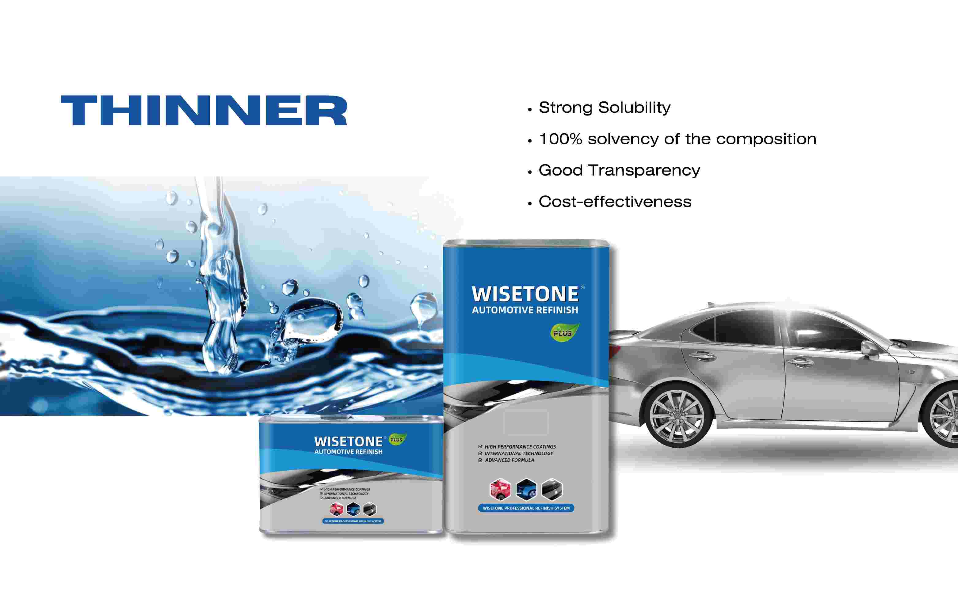 WISETONE PLUS Automotive Thinner is a high-quality solvent designed to optimize paint flow, leveling, and application in automotive refinishing. With strong solvency power and 100% solvent-based composition, it ensures excellent transparency, smooth finish, and cost-effective performance for both professional and industrial applications.